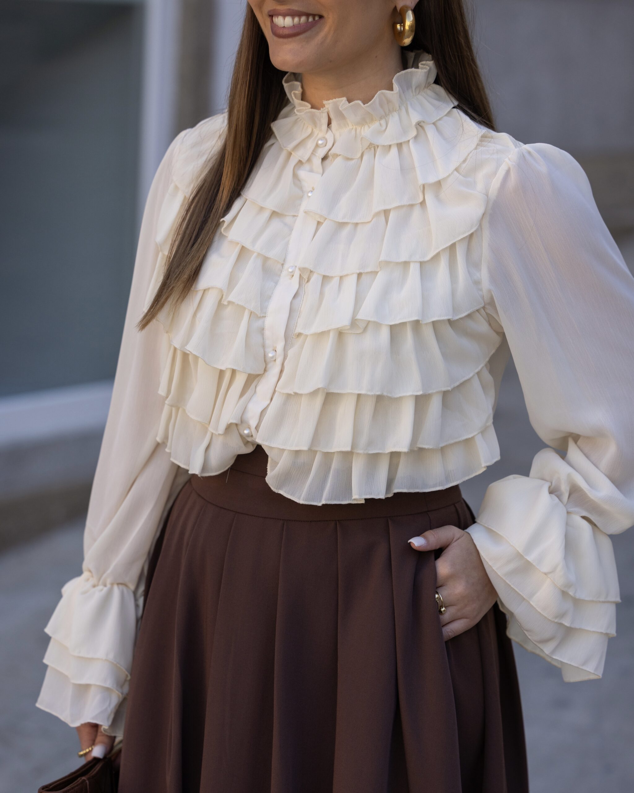 Esta blusa em tecido leve e fluido traz um toque sofisticado ao visual com camadas de folhos frontais e nas mangas. O botões com detalhe em perola e o acabamento delicado no colarinho conferem charme extra. Ideal para composições clássicas ou modernas, combinando perfeitamente com saias e/ou calças de alfaiataria.