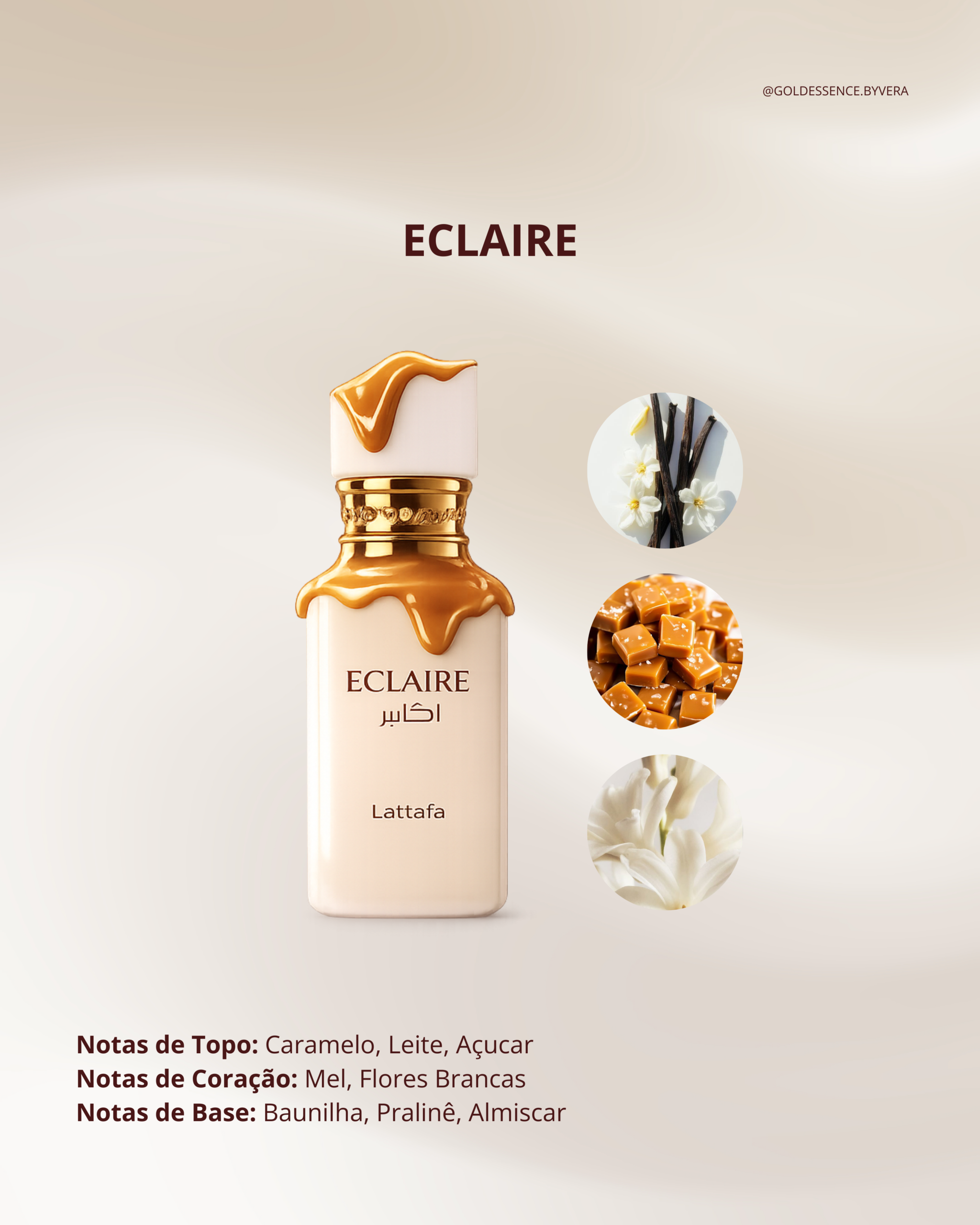 O Lattafa Eclaire é um dos perfumes mais virais da marca, amplamente reconhecido como o dupe (equivalente) mais fiel ao nicho Bianco Latte da Giardini Di Toscana. É uma fragrância puramente gourmand, descrita como "açúcar e caramelo engarrafados".