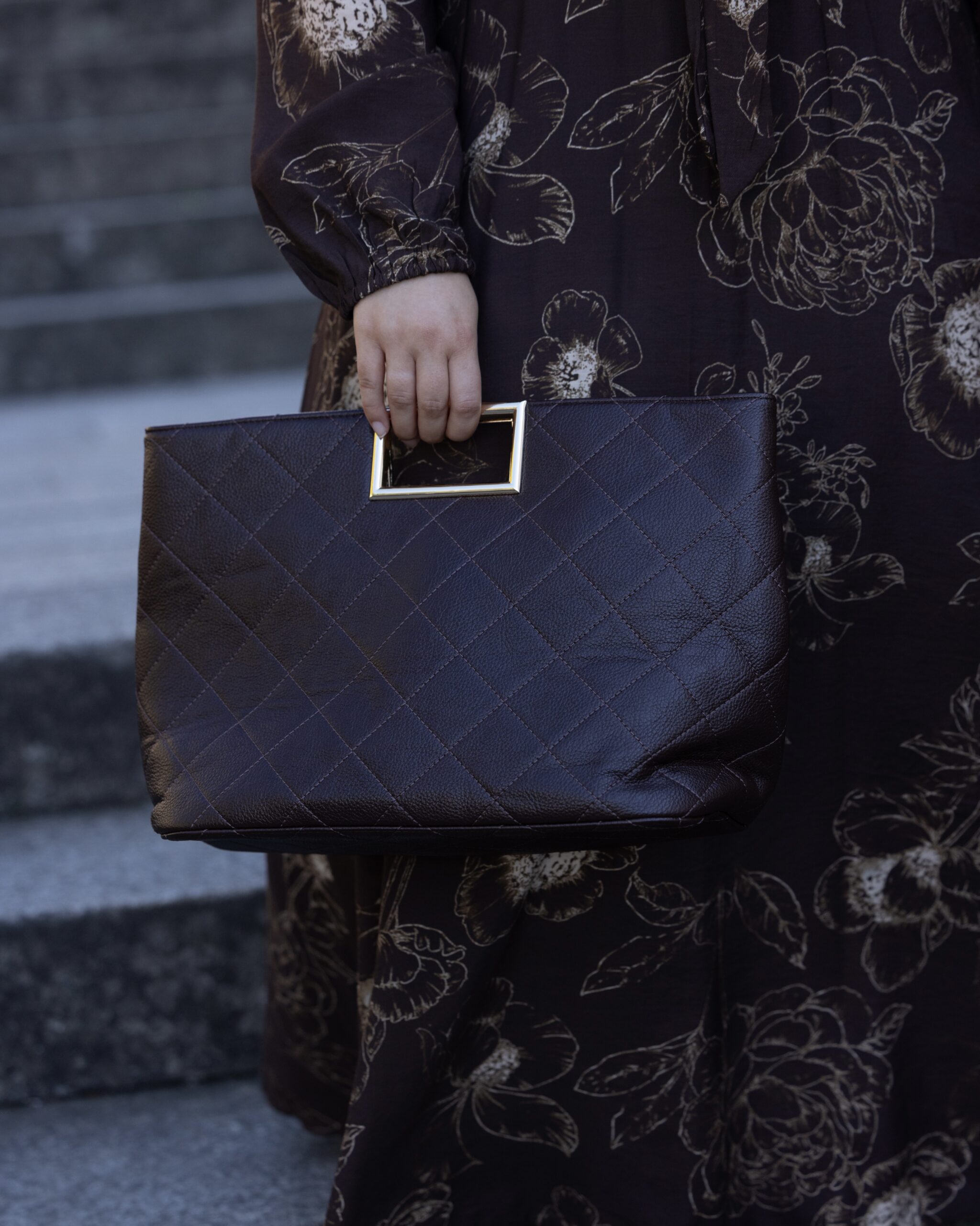 Mala de mão com pega retangular dourada.