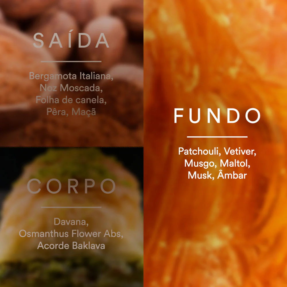 No coração, a fragrância revela o seu lado mais exótico. A delicadeza da flor de Osmanthus contrasta com a riqueza doce e viciante do exclusivo acorde Baklava, criando uma experiência olfativa única.